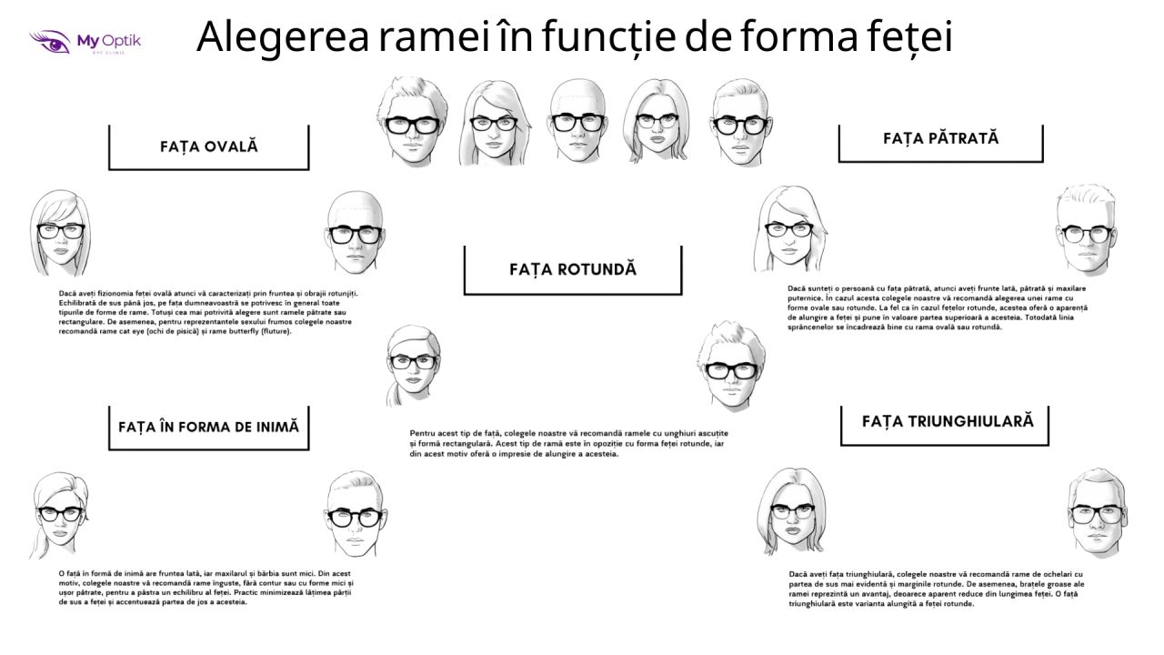 Când vine vorba de alegerea ochelarilor de vedere în funcţie de forma feţei, se recomandă o formă a lentilei opuse formei feţei. Pentru faţa rotundă, ramele pătrate sunt cele mai potrivite, iar pentru faţa pătrată, se potrivesc ramele rotunde. Persoanelor cu faţa ovală li se potriveşte, în principiu, orice tip de ramă.
